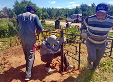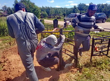 На каждом из четырёх углов вкручиваем сваи. Грунт на данной могиле попался твёрдый, после того, как сваи уже не вкручиваются, начинаем их забивать. Окончательно загнать сваи в землю так и не удалось, поэтому срезаем выступающие части. На качестве каркаса данное решение никак не отобразилось, так как длинна наших свай всегда несколько больше, чем требуется.