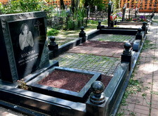 На данном месте захоронения мы ежемесячно проводим уборку: клиент желает поддерживать могилу в постоянной чистоте. Так как порядок на участке наводится регулярно, то и работы здесь не особо много: почистить брусчатку, сквозь которую кое-где прорастает мелкая травка, а также вытереть от пыли ограждение и памятник.